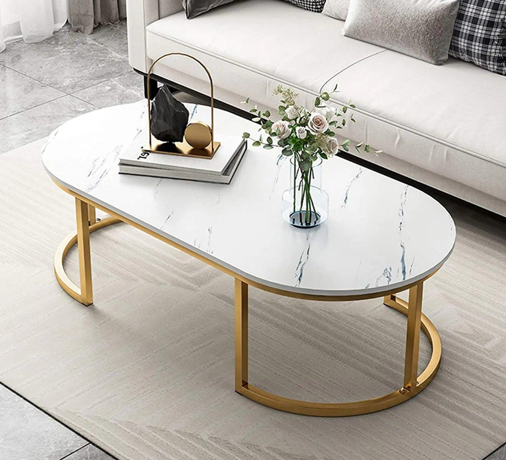 حان وقت تجديد منزلك بأسلوب فريد. - طاولة وسط بيضاوية الشكل بتصميم ديكورى بسيط بشاسية حديد باللون الذهبي اللامع - الطاولة بابعاد 70 سم طول 40 سم عرض 45 سم ارتفاع - مصنوع من استيل مطلى دهان فرن الكتروستاتيك ضد الصدأ والرطوبة وعوامل الجو وسطح من رخام ابيض كرارة او زجاج 6 ملى او خشب أم دى أف