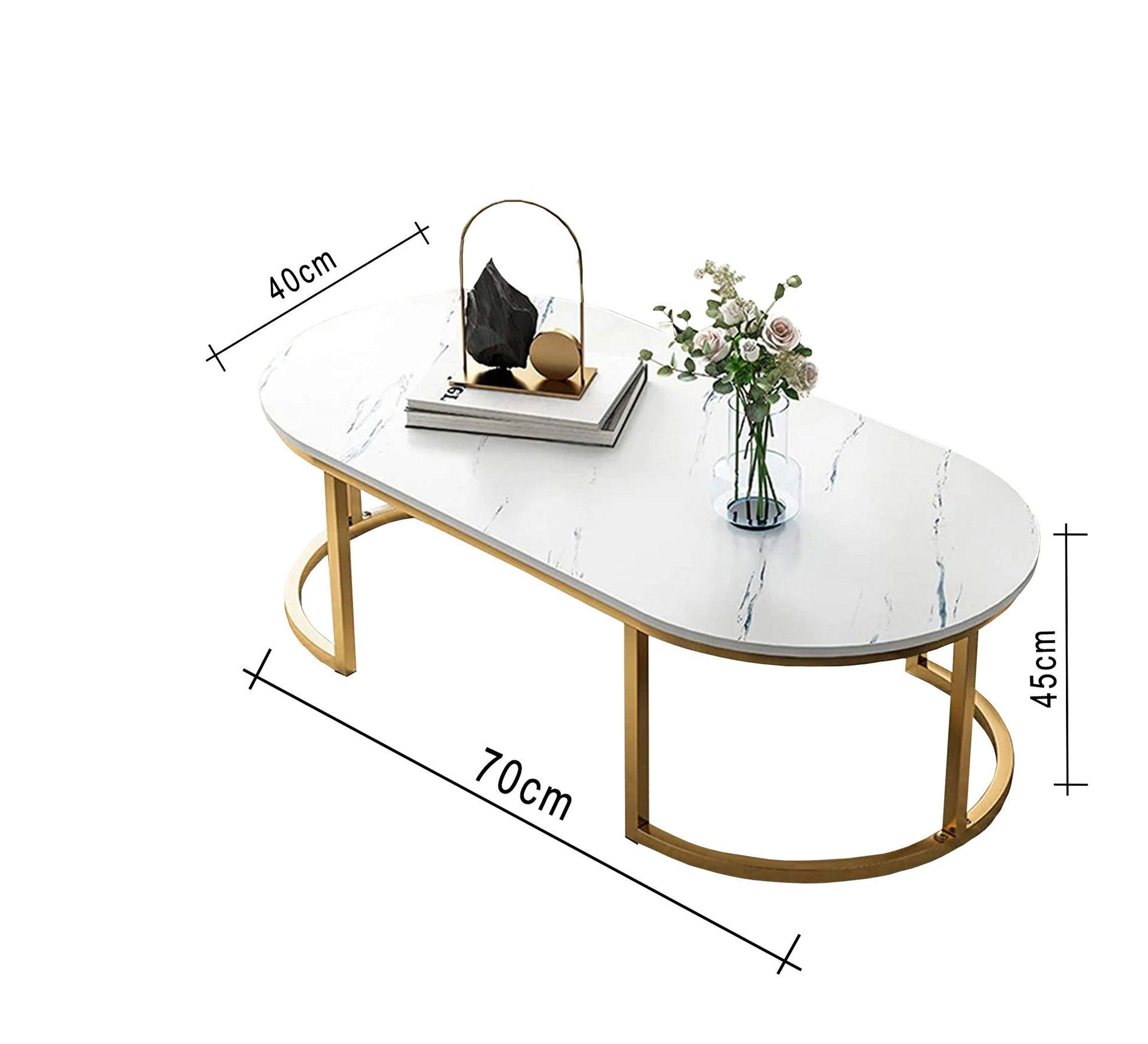 حان وقت تجديد منزلك بأسلوب فريد. - طاولة وسط بيضاوية الشكل بتصميم ديكورى بسيط بشاسية حديد باللون الذهبي اللامع - الطاولة بابعاد 70 سم طول 40 سم عرض 45 سم ارتفاع - مصنوع من استيل مطلى دهان فرن الكتروستاتيك ضد الصدأ والرطوبة وعوامل الجو وسطح من رخام ابيض كرارة او زجاج 6 ملى او خشب أم دى أف